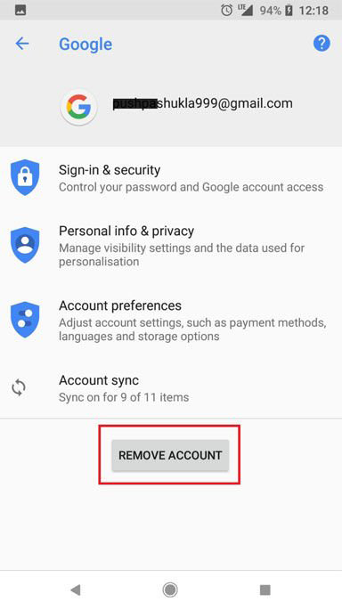 - Faites défiler vers le bas et cliquez sur le bouton Supprimer le compte pour supprimer votre compte Google de votre appareil.