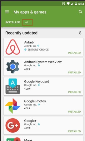 - Ici, vous verrez la liste de toutes les applications installées. Juste à côté de l’option installée, vous pouvez voir une option «Tous». En cliquant dessus, vous obtiendrez un historique complet de toutes les applications que vous avez installées précédemment sur votre téléphone avec le même compte Google. Même vous pouvez également voir ces applications que vous avez installées sur d’autres téléphones Android avec le même compte.