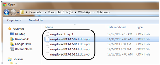 • Recherchez ensuite les fichiers de discussion stockés avec des noms tels que «msgstore-YYYY-MM-DD.1.db.crypt»