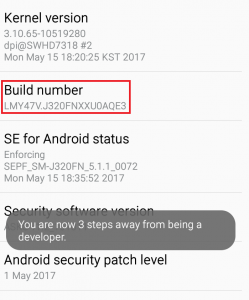 • Maintenant sur le nouvel écran, cliquez sur le numéro de build pendant un certain temps, sauf si l’option «option de développeur est activée»